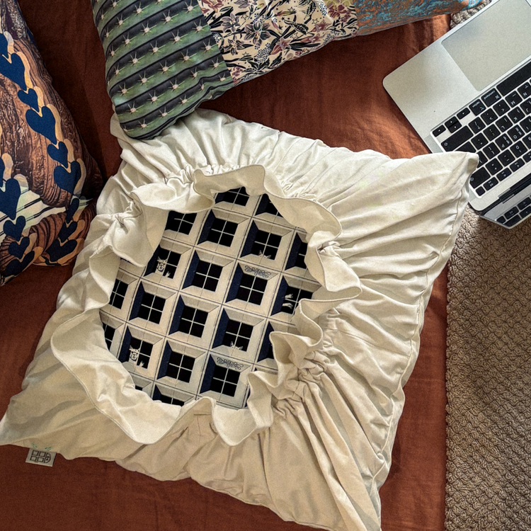 복잡했던 하루를 내려놓고 고요한 집에서 마음을 기댈 수 있는 쿠션 시리즈 Cuveree입니다. 그 중에서 차가운 도시 속 라마가 창문 너머로 건네는 따뜻한 인사'를 담은 이너입니다. 건물 외벽의 기하학적인 패턴이 매력적이며, 사이로 보이는 라마의 익살스러운 모습이 생기 있는 분위기를 만들어냅니다. Llama’s Flat Cuveree는 총 300개만 제작되었습니다.