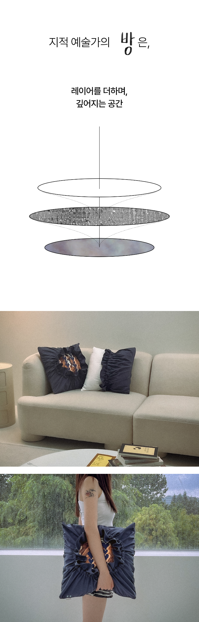 지적 예술가의 방은 시간이 지날수록 취향의 겹겹이 쌓이며 깊어지는 공간입니다. 그런 공간에 어울리는 사호의 쿠션 시리즈 Cuveree 아우터에는 괴테의 '비움'과 '채움'이 담겨있습니다. 중앙의 비어있는 공간에는 나의 취향을 마음껏 표현할 수 있습니다. 비움이 곧 충만의 조건이라고 말하는 괴테의 철학을 모티프로 디자인하였습니다. 짙은 블루 컬러가 중앙부에 깊이감을 만들어 이너를 더욱 유니크하게 만들어주는 아우터입니다. Blue Fountain Cuveree는 총 40개만 제작되었습니다.