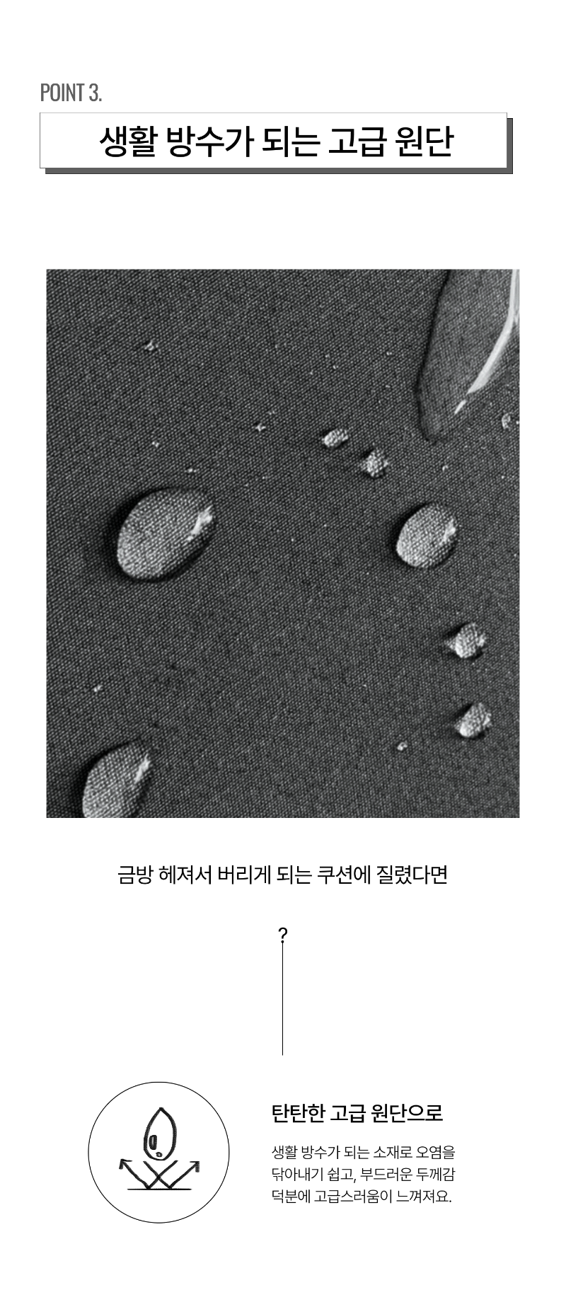 생활방수가 되는 소재로 쉽게 오염을 닦아낼 수 있고, 부드러운 탄성과 두께감을 가지고 있어 제품에 깊이감과 고급스러움을 더합니다.