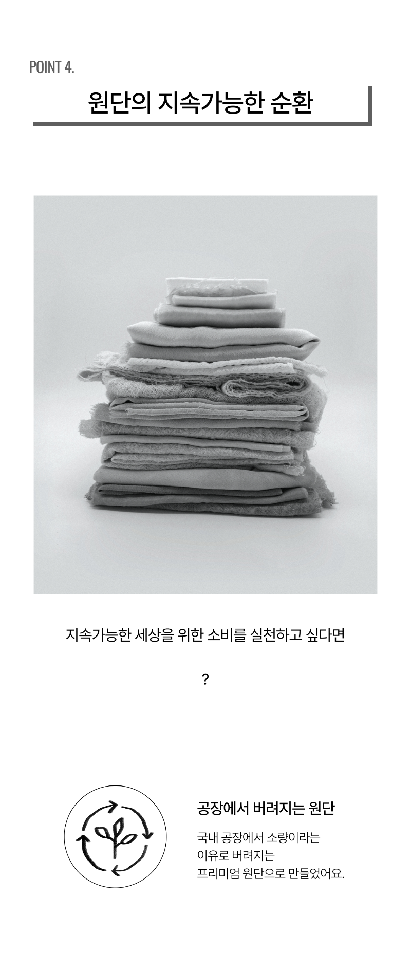 모든 아우터는 국내 공장으로부터 공급받은 재고 원단을 사용합니다. 대량으로 납품하는 공장 시스템 상 재고 원단은 필연적으로 발생합니다. 이에 훌륭한 품질의 재고 원단을 사용함으로써 과도한 원단 폐기로 인한 탄소 저감을 줄이고, 국내 원단 공장이 지속 가능할 수 있는데 동참합니다.